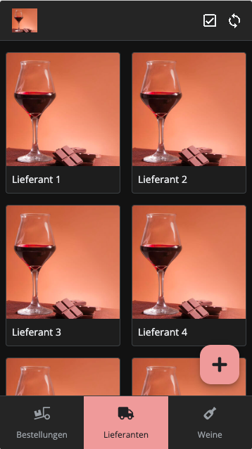 Easy backend. Google based only01widgetsOrders tab. minimalistic UI02account_boxAlways overview, change or edit your suppliers03New drinks or wines? easy, just create a new entry04where_to_voteJust select the wine you need. Your app knows where to order05visibilityAlle wichtigen Dinge auf einer Page.06